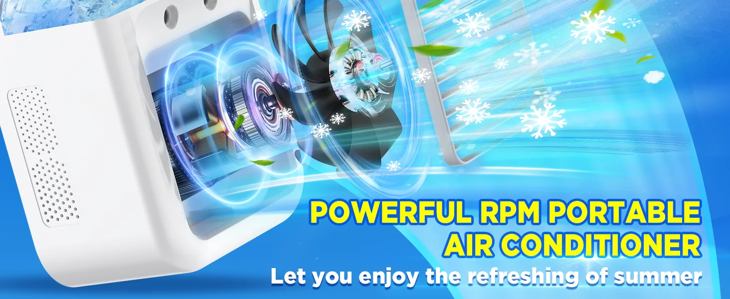The portable air conditioner has a 500ML capacity water storage tank built into the top of the unit, which can continuously produce spray water molecules for air cooling and humidification.